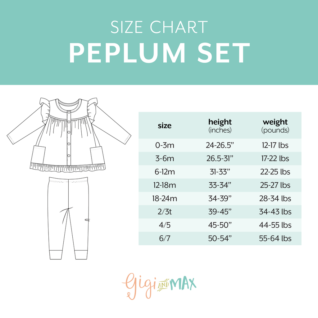 We are have bought quite a few outfits from Gigi and Max for our granddaughter and love them all. The peplum set is soft, colorful and comfortable. Thank you Gigi and Max!