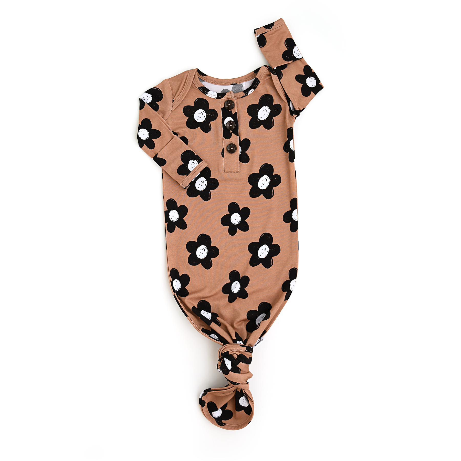 This listing is for a Newborn Sized super soft and stretchy knotted baby gown. Matching headband can be purchased along with the gown in the dropdown of this listing.
