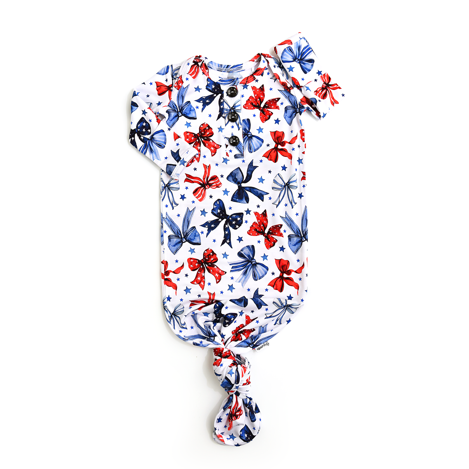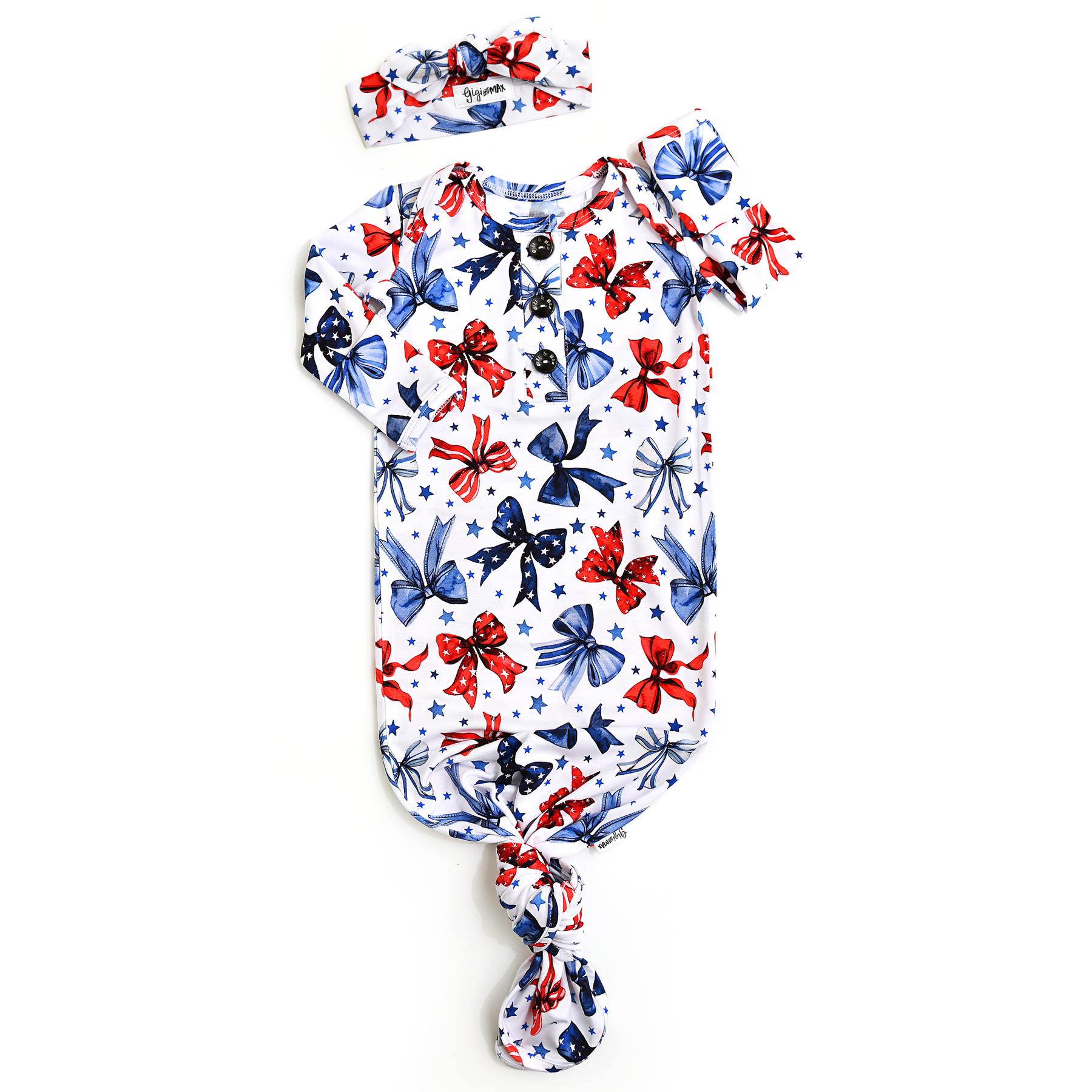 This listing is for a Newborn Sized super soft and stretchy knotted baby gown. Matching headband can be purchased along with the gown in the dropdown of this listing.