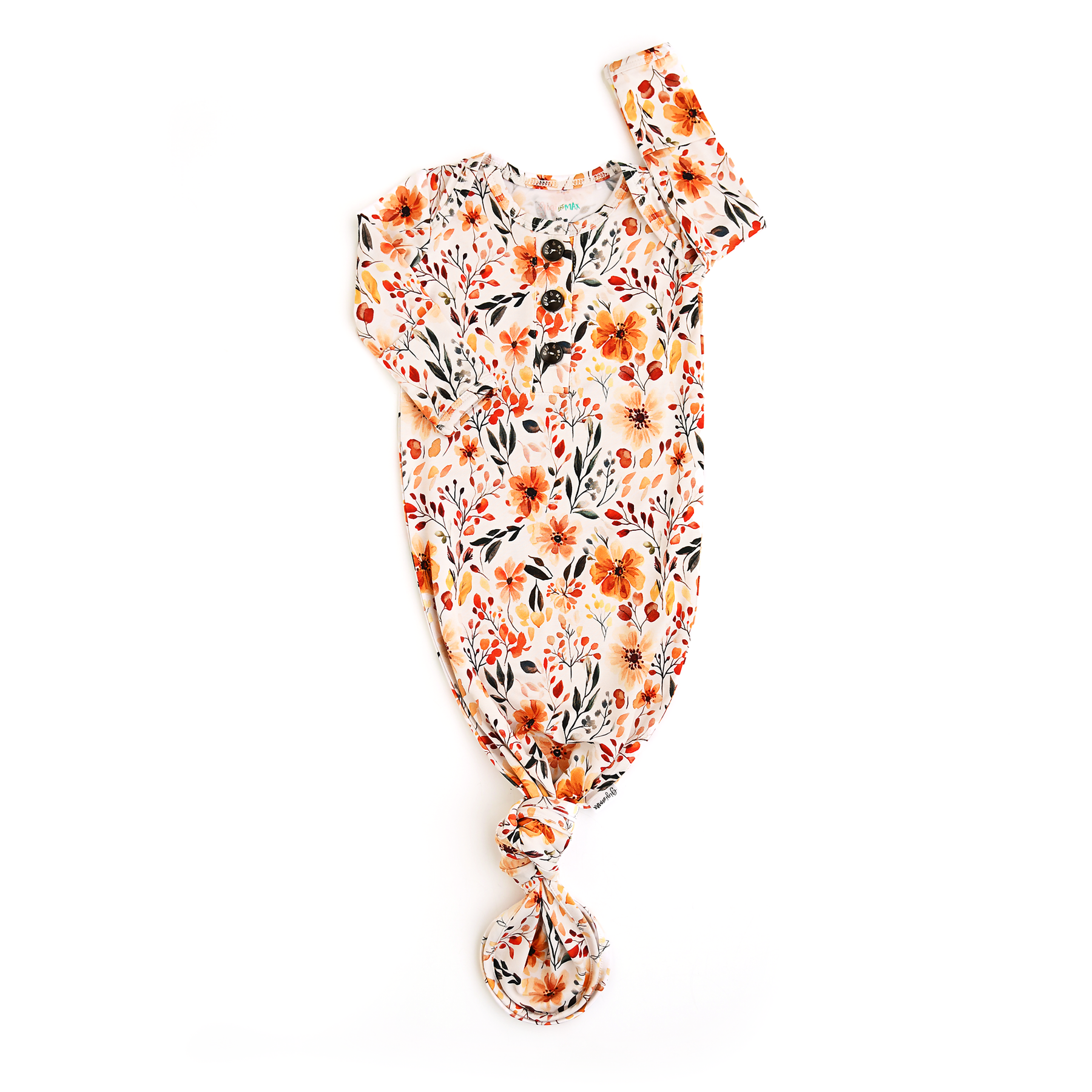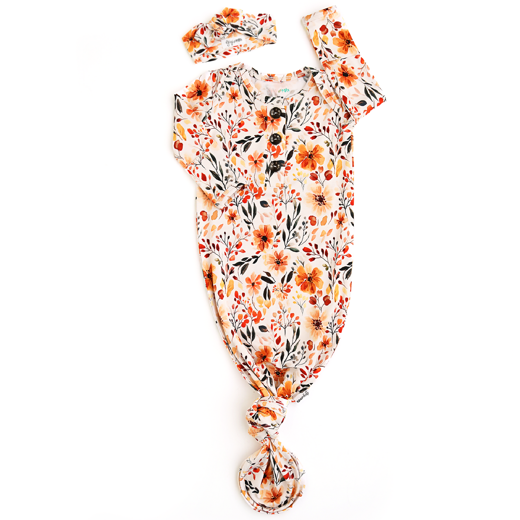 This listing is for a Newborn Sized super soft and stretchy knotted baby gown. Matching headband can be purchased along with the gown in the dropdown of this listing.