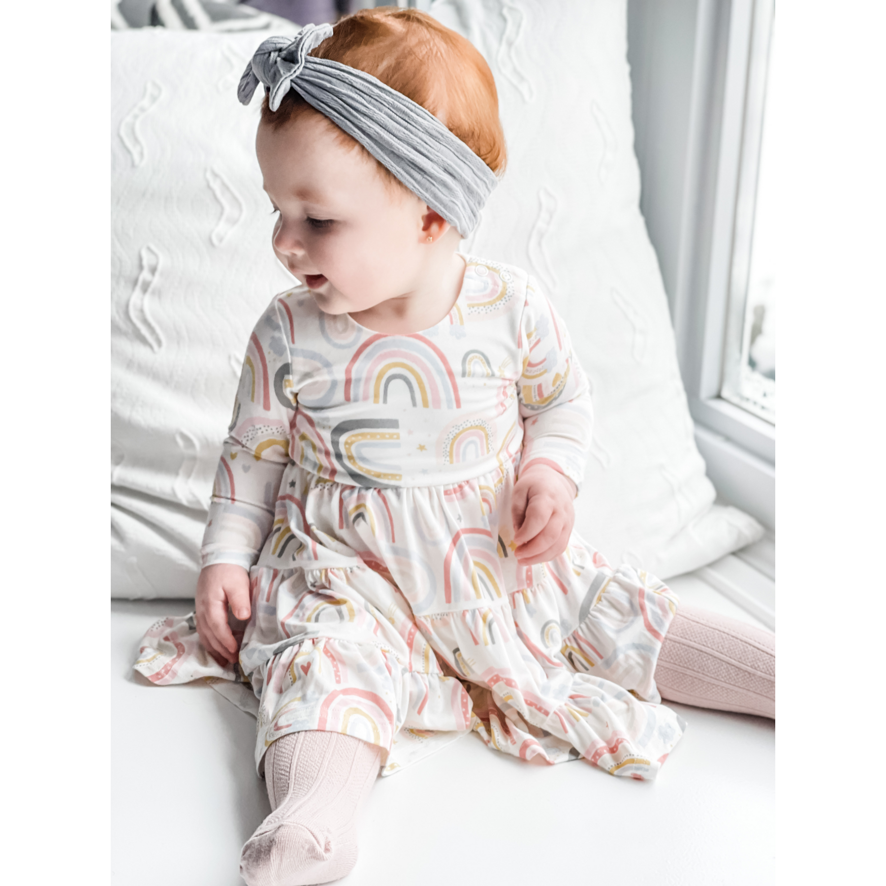 Perfect twirl dress! Soft, comfortable, very twirly. I wish the colors were a little less muted for the rainbows but my daughter loves it