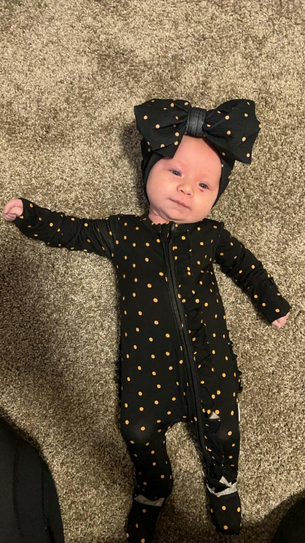 Due to the differing fabric, the coloring in the bow is not an exact match to our bamboo clothing.