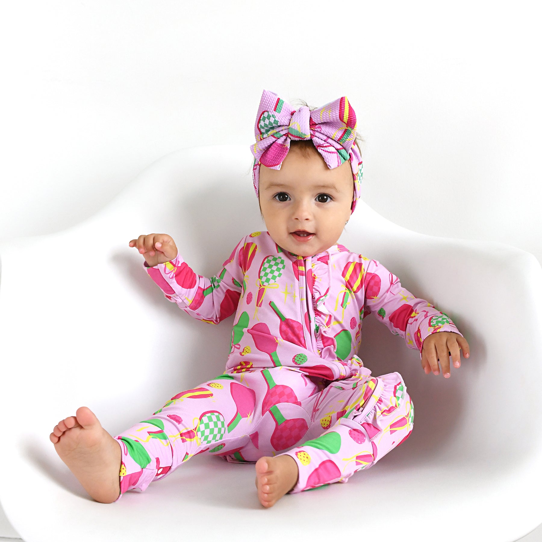 Due to the differing fabric, the coloring in the bow is not an exact match to our bamboo clothing.