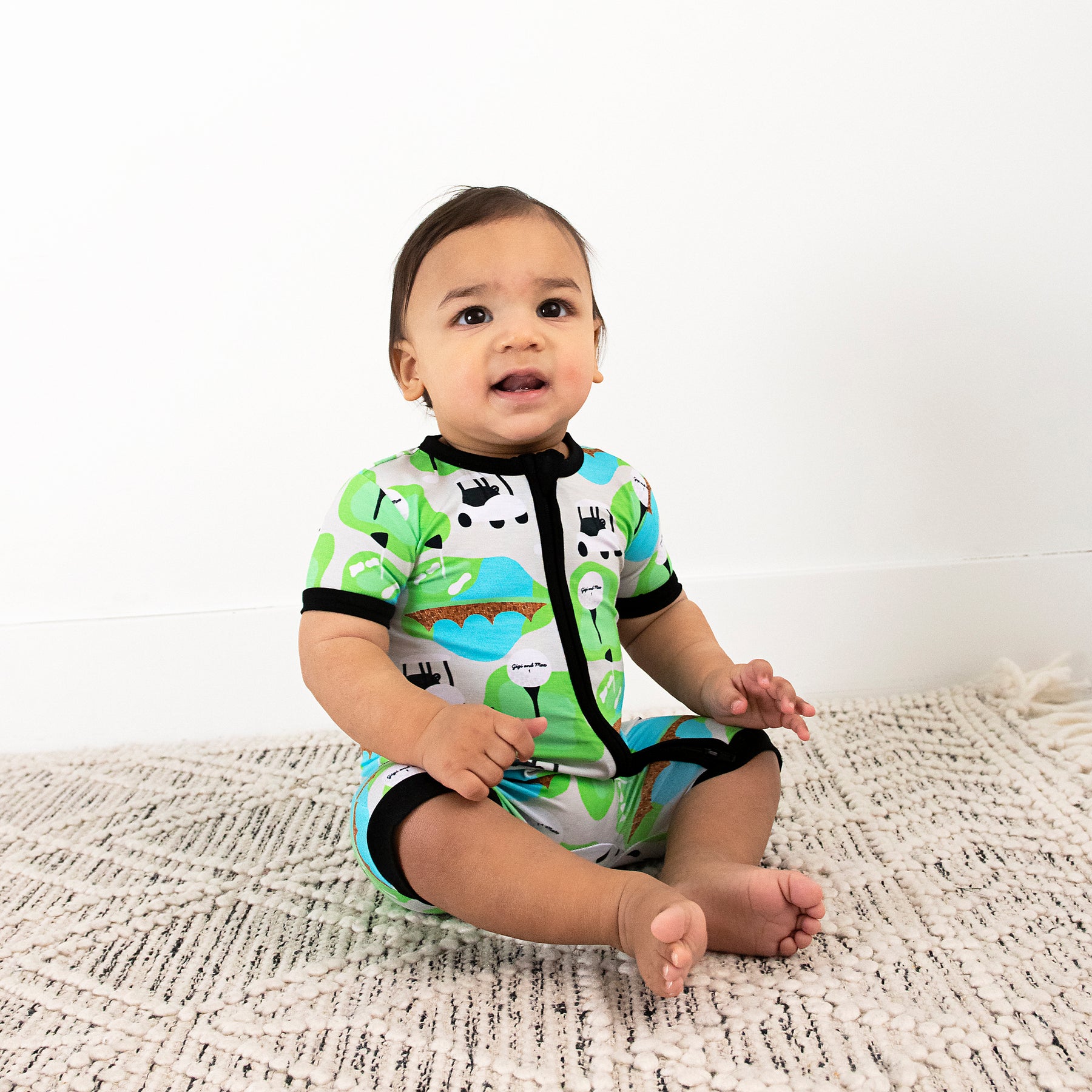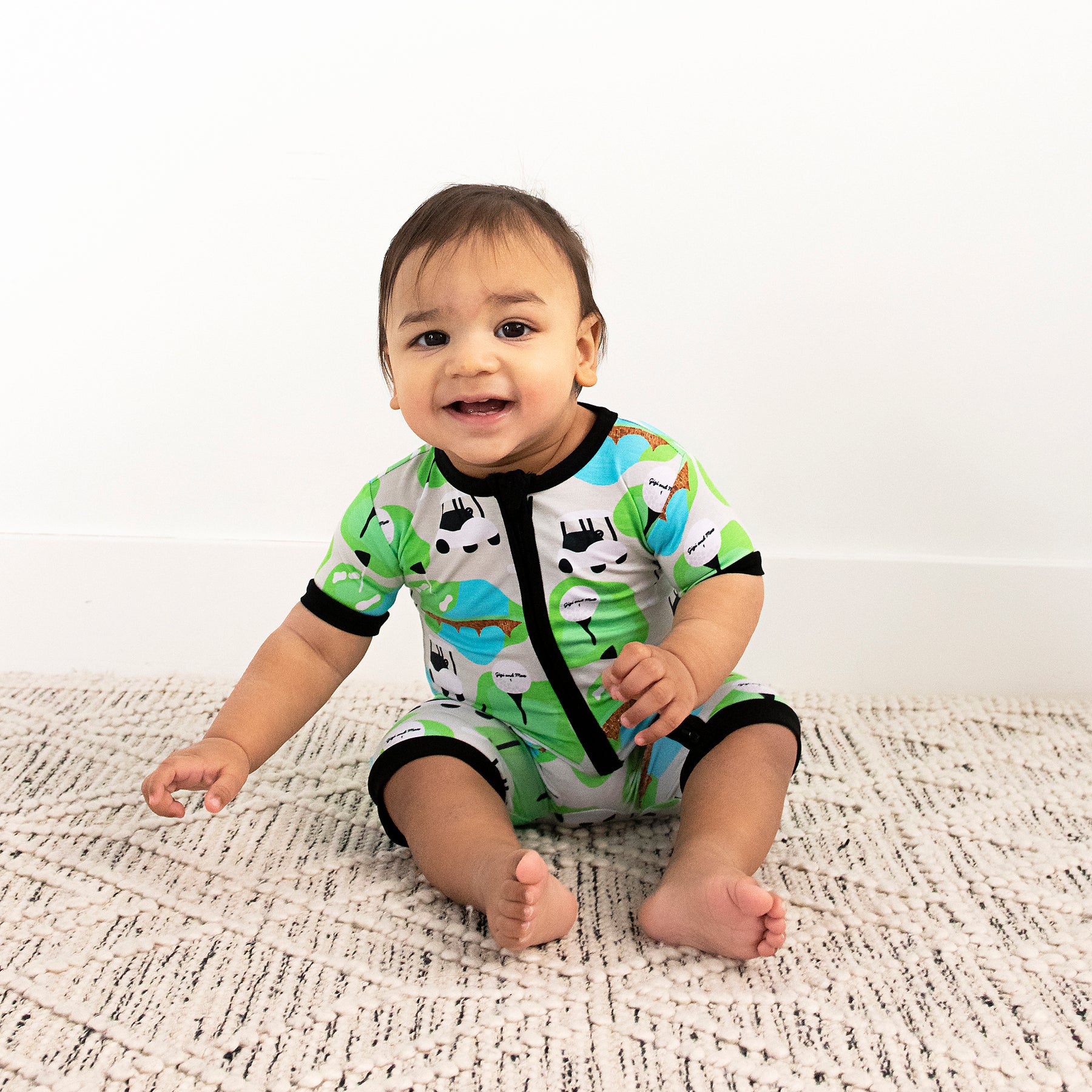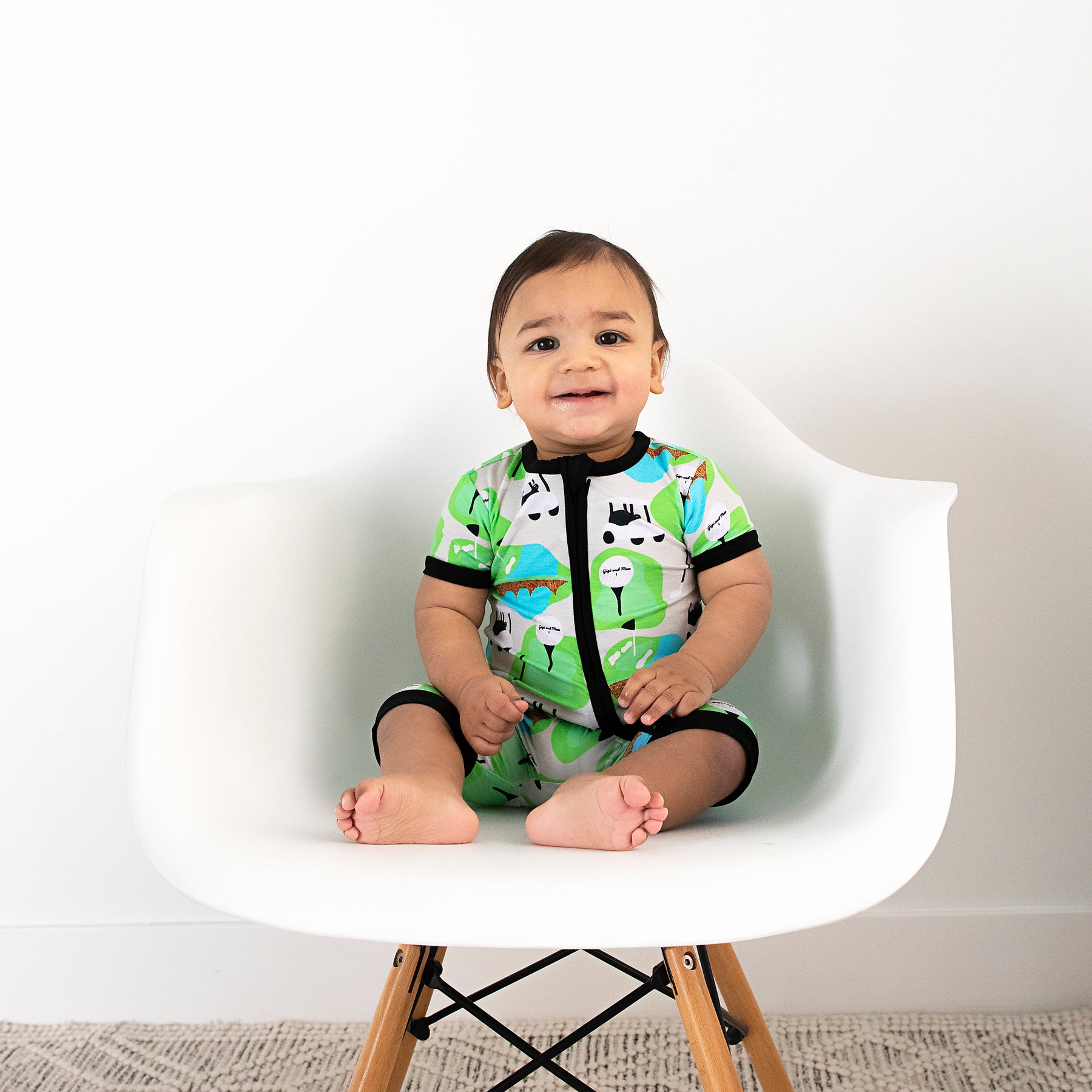 This shorty zip one piece is super soft and comfortable. Featuring a 2 way zipper that runs from the top of the outfit to the bottom. Making for super easy diaper changes without having to remove the whole outfit. The fit is the same as our Zip style.