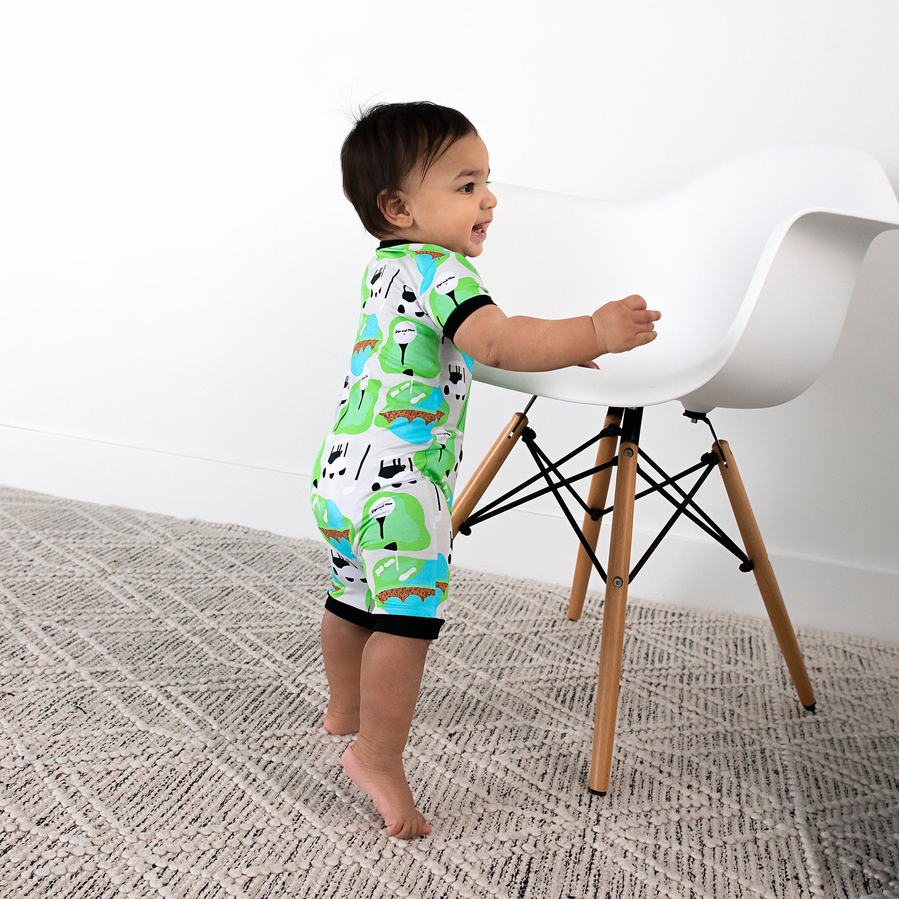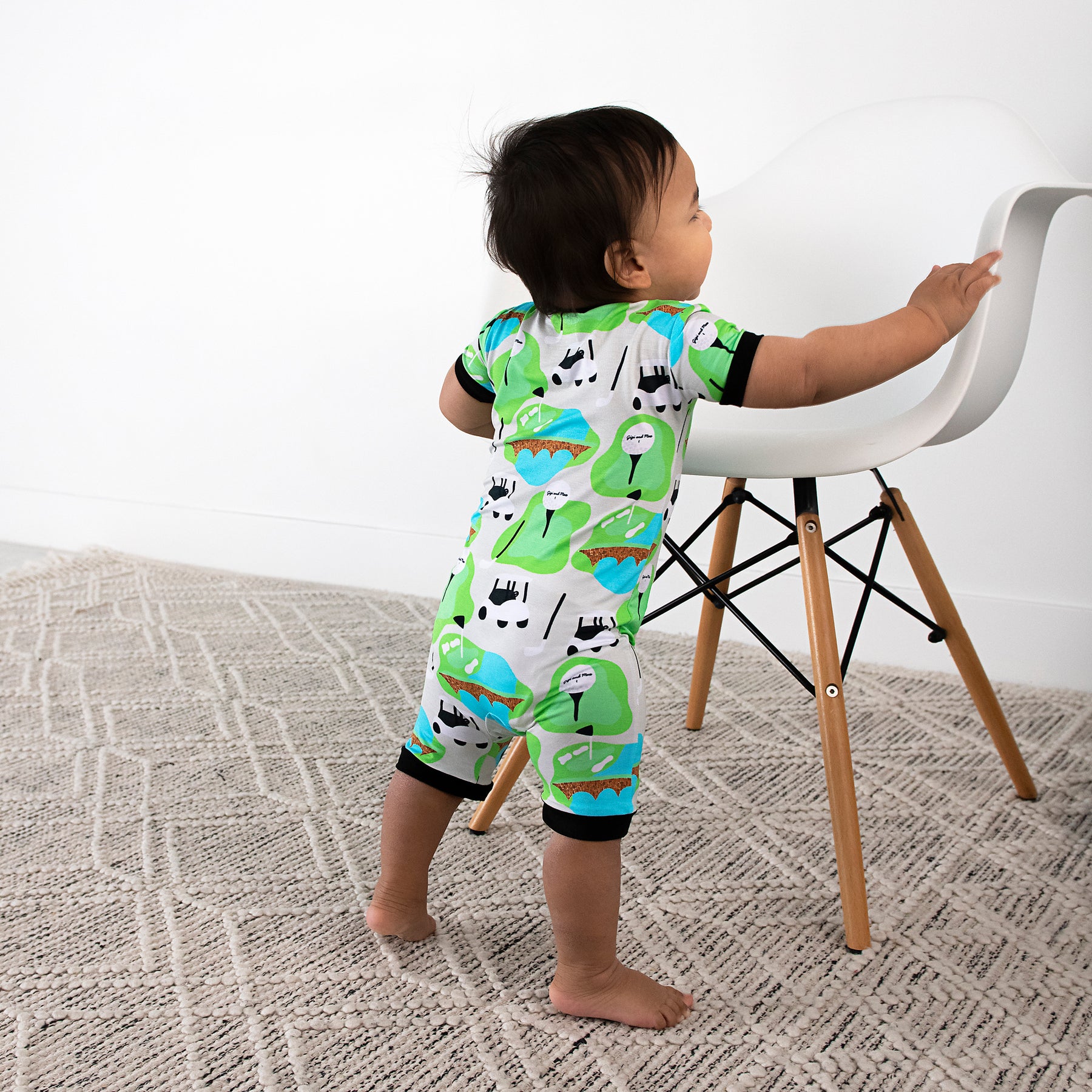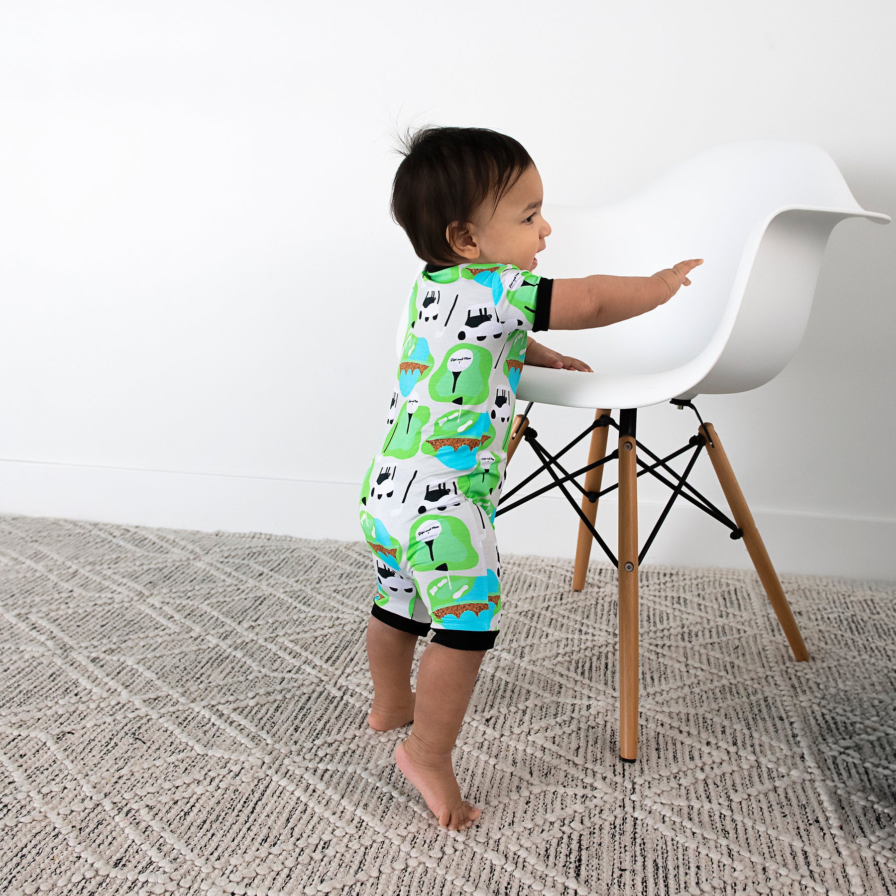 This shorty zip one piece is super soft and comfortable. Featuring a 2 way zipper that runs from the top of the outfit to the bottom. Making for super easy diaper changes without having to remove the whole outfit. The fit is the same as our Zip style.