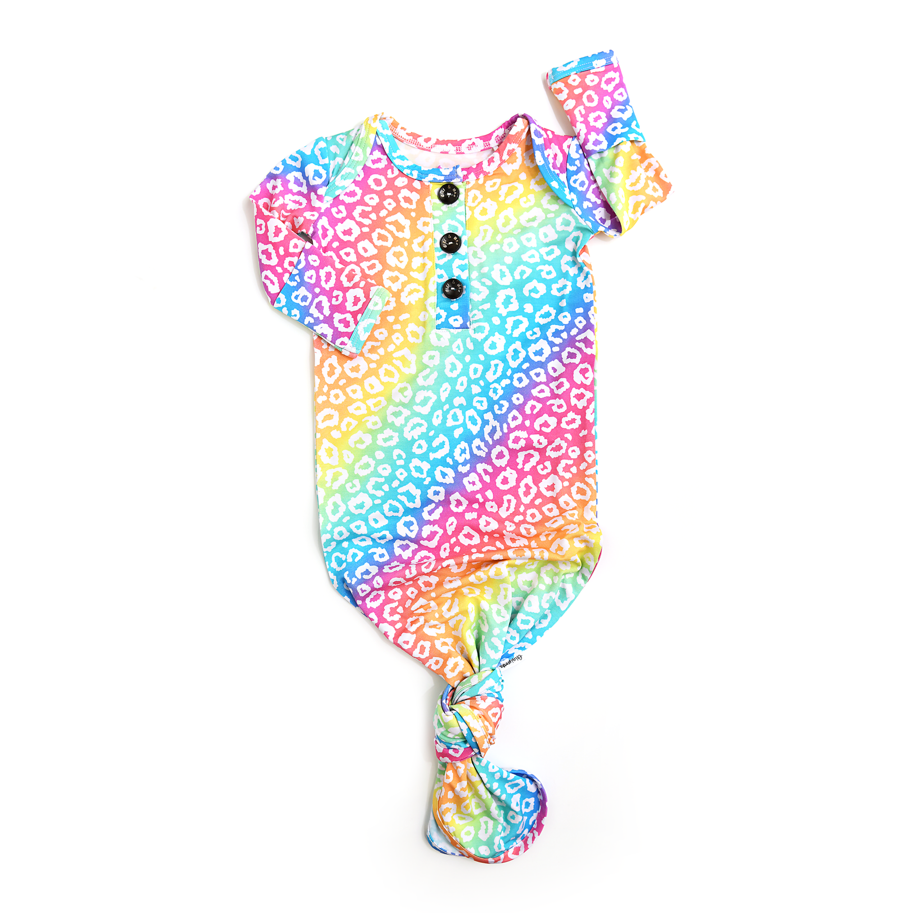 Coordinating buttons and the slits at the shoulder make taking on and off baby from the top down very easy! Knot on the gown can be tied and untied as needed for quick diaper changes!